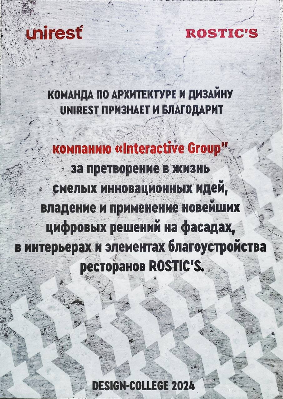 В рамках DESIGN-COLLEGE 2024, которую традиционно организует UNIREST (ранее Yum! Brands Russia) наша компания получила диплом за партнерство и вклад в развитие бизнеса. Гордимся нашим сотрудничеством и работой. Претворяем в жизнь самые смелые идеи наших партнеров, внедряем инновации и движемся только вперед!!!